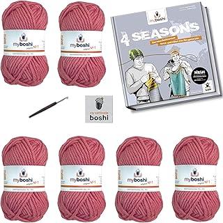myboshi No.1 Wolle Häkel-Set 6x50gr Farbe 139 Himbeere |+ Buch Four Season | + passende Häkelnadel Stärke 6,0mm | + 3 Labels zum Aufbügeln
