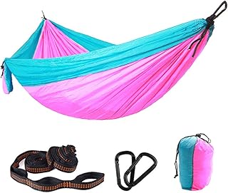Purjoy Camping-Hängematte, Einzel- und Doppel-Hängematte mit 2 Baumgurten (36 Schlaufen/6 m insgesamt), leichte Nylon-Hängematten für Rucksackreisen, Reisen, Strand, Hellblau/Rosa1, Single(1 person)