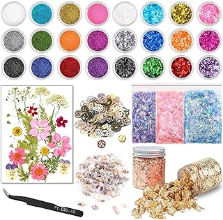 KKSJK Epoxidharz Zubehör Set mit Glitzer, Pailletten, Trocken Blumen, Goldfolie, Muscheln, Zahnräder, Pinzetten, für Harz Handwerk und Nagelkunst Dekoration