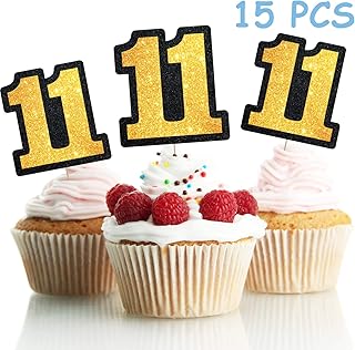 LINGPAR 11 Years Old Black Gold Cake Toppers Happy 11th Birthday Cupcake Toppers Eleven Birthday Party Decoration Supplies 15PCS