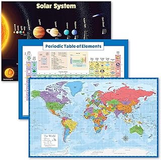 Poster mit Sonnensystem, Periodensystem der Elemente für Kinder, Weltkarten-Diagramm [Blauer Ozean], laminiert, 45,7 x 61 cm, 3 Stück